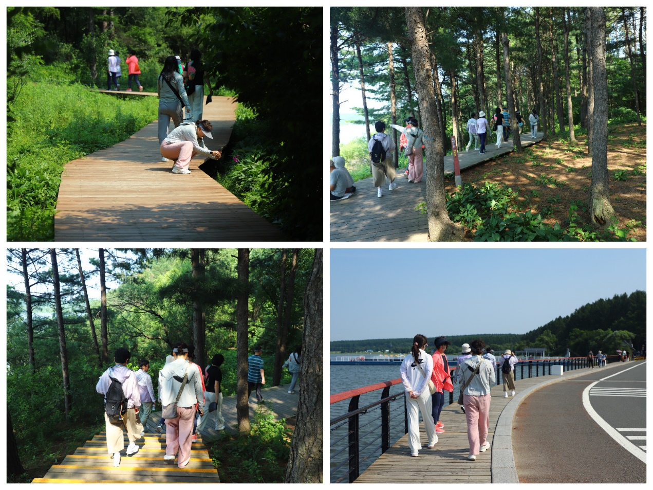 徒步自净月潭西门徒步栈道起始,老师们轻装简行、欢声笑语,在行进中途经环湖栈道、森林浴场,穿过松林小径,至滑雪场附近休整后,乘坐园区游览车回到正门。活动全程,老师们共同探寻了林间的不同植物,并不时分享着各自工作与生活中的点点滴滴。