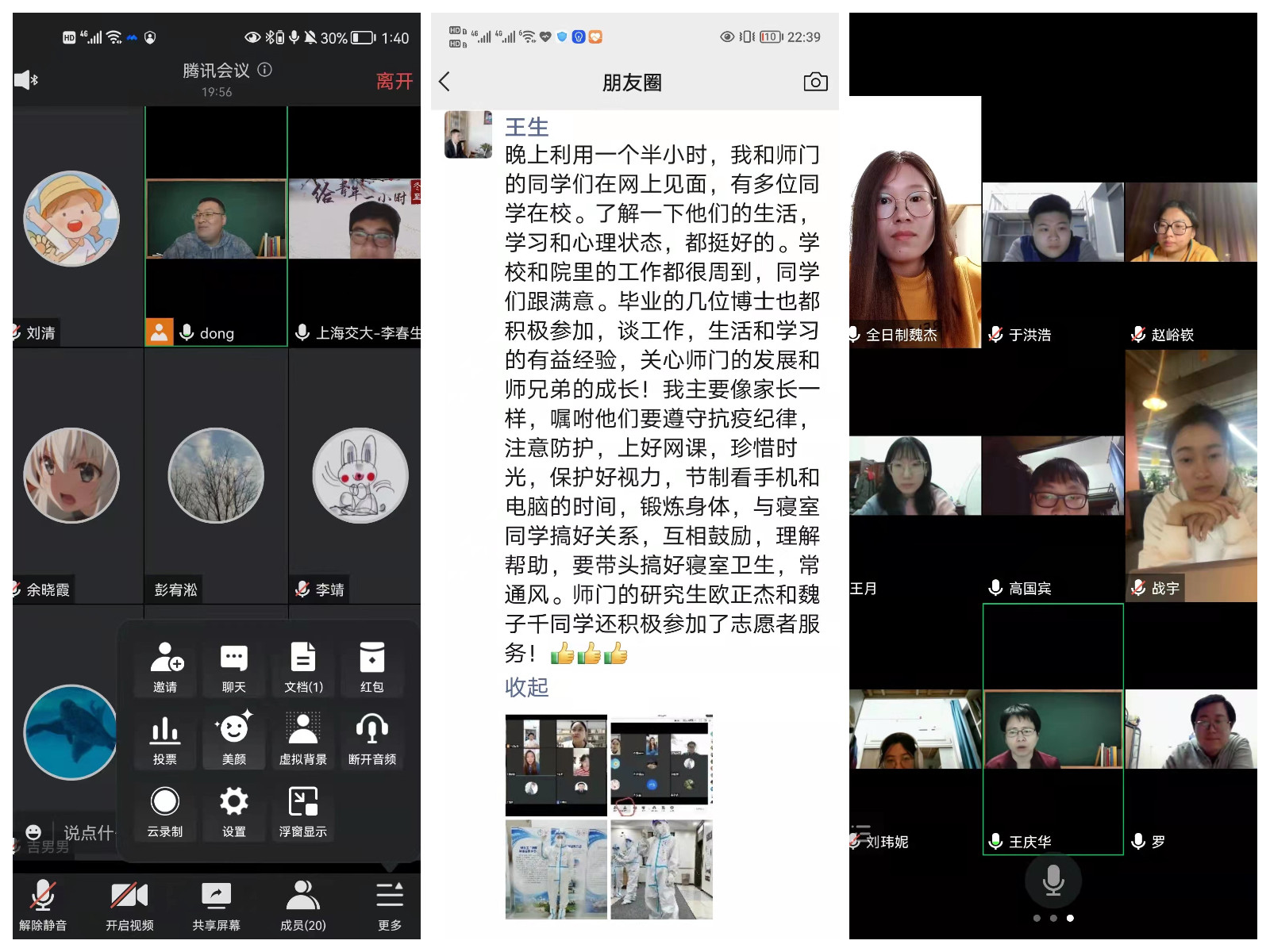 学生指导方面,受市区和校园的疫情防控政策影响,导师们无法同此前一样与同学们固定时间、固定地点召开组会,如何及时了解同学们的思想动态与学业进展,成为了疫情管控期间的一大挑战。部分导师在校园封闭管理后,第一时间通过线上组会方式与同学们面对面交流,及时关怀毕业年级同学的论文修改情况,对承担志愿工作的志愿者同学们进行慰问,关心同学们在寝室封闭管理中的心理状态,同时也就当前科研团队各项任务的工作进展、理论学习等进行指导与解答。