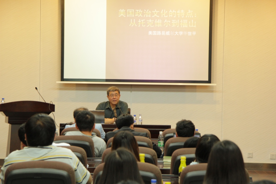 师生做了一场题为“美国政治文化:从托克维尔到福山”的学术报告。在华教授两个小时的讲座中由托克维尔的《论美国的民主》和福山的《历史之终结与最后一人》两本政治学经典著作展开,结合自身在美国生活研究的经历讨论美国的民主政治这一议题。
