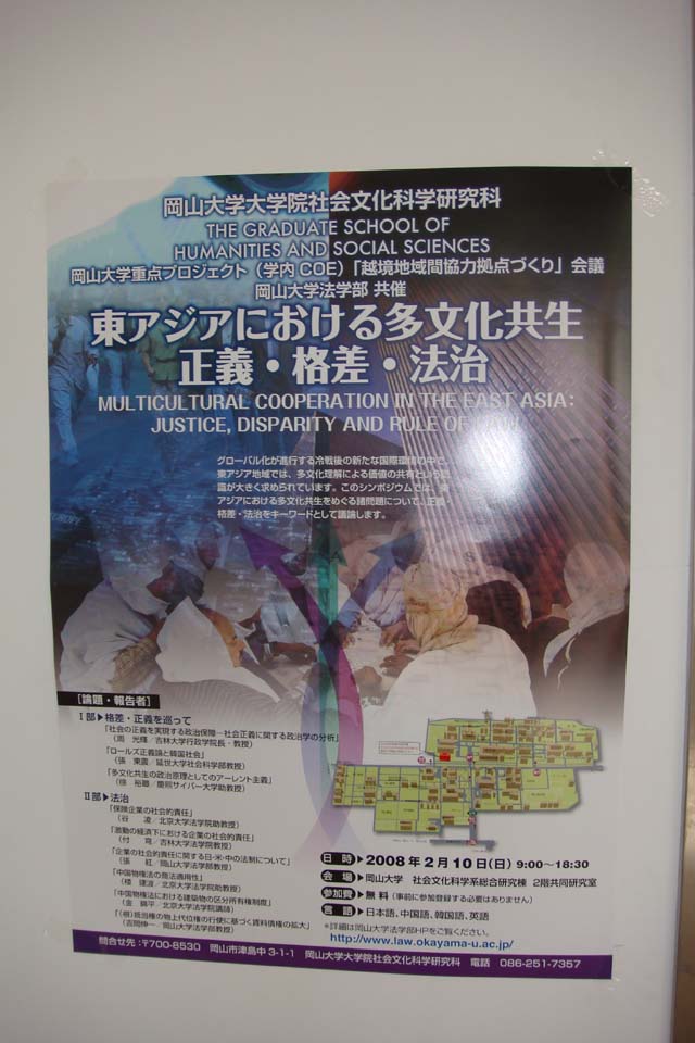 2008年2月8日—11日,中国政治学会副会长、成人抖音 院长周光辉教授应邀赴日本参加“东北亚多元文化下面对区域差异寻求共存与法治问题”中日韩国际学术研讨会,本次国际学术会议由日本冈山大学社会文化科学研究所主办。学术研讨会由中日韩三国相关领域的专家学者参加,专家学者们围绕冷战后东北亚多元文化的格局,如何应对区域差异、实现社会正义等主题进行了深入地研讨与交流。会议期间,周光辉教授做了题为“民主:实现社会正义的政治的保障——关于社会正义的政治学分析”的主场报告,引起了与会专家学者的热烈反响。