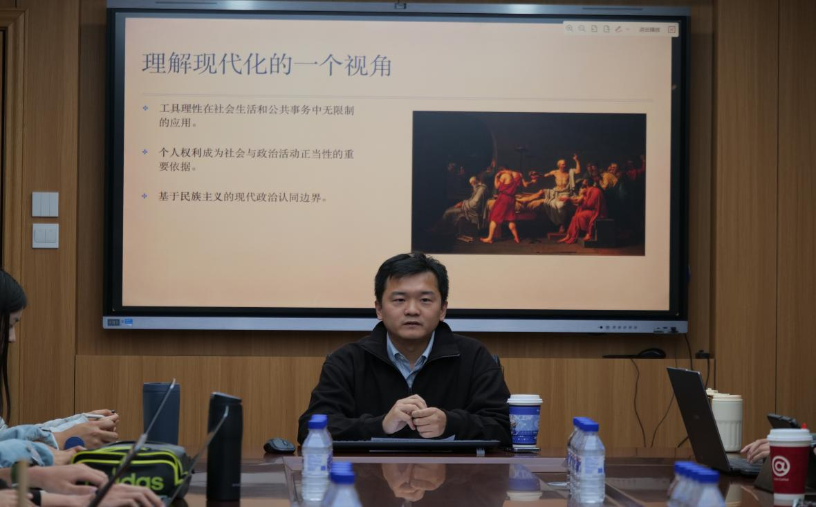 研讨环节,赵德昊老师以“为什么西方现代化过程容易滋生动乱?”为议题,与参会同学展开互动,结合读书会研讨文本,指出西方现代化所引发的社会变革将新的社会集团迅速动员起来卷入政治,但政治制度化和组织化水平未能同步跟进,加速了旧秩序崩塌。