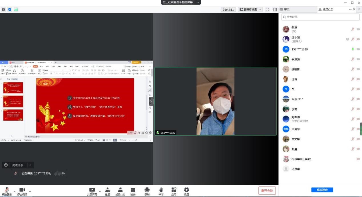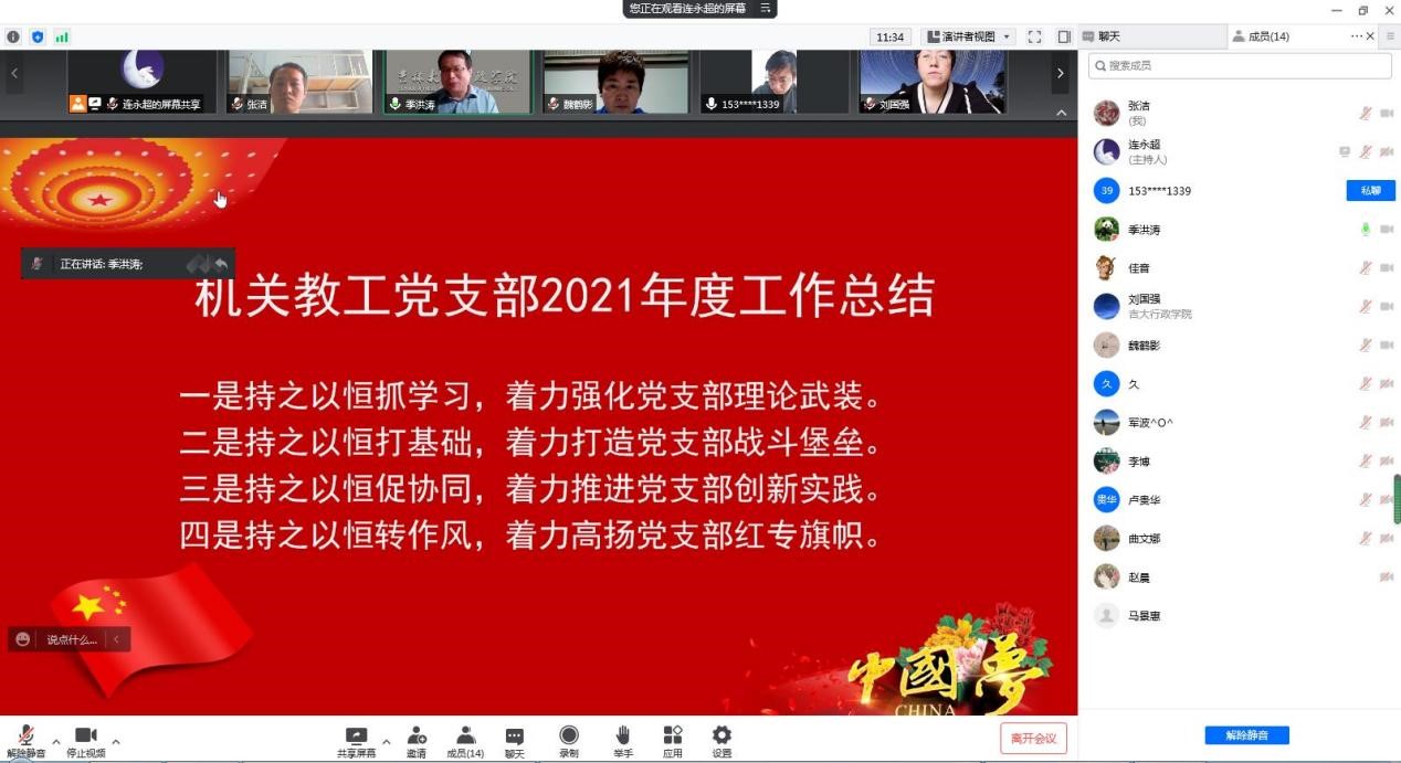首先,由支部书记对2021年度工作进行总结。季洪涛提出,2021年度在上一届支部书记密佳音和本届支委共同带领下,支部工作取得良好的成绩:一是持之以恒抓学习,着力强化党支部理论武装。二是持之以恒打基础,着力打造党支部战斗堡垒。三是持之以恒促协同,着力推进党支部创新实践。四是持之以恒转作风,着力高扬党支部红专旗帜。同时,季洪涛对2022年成人抖音