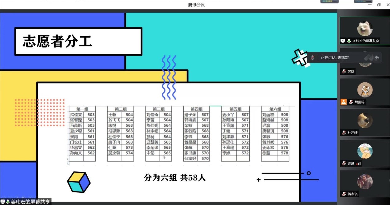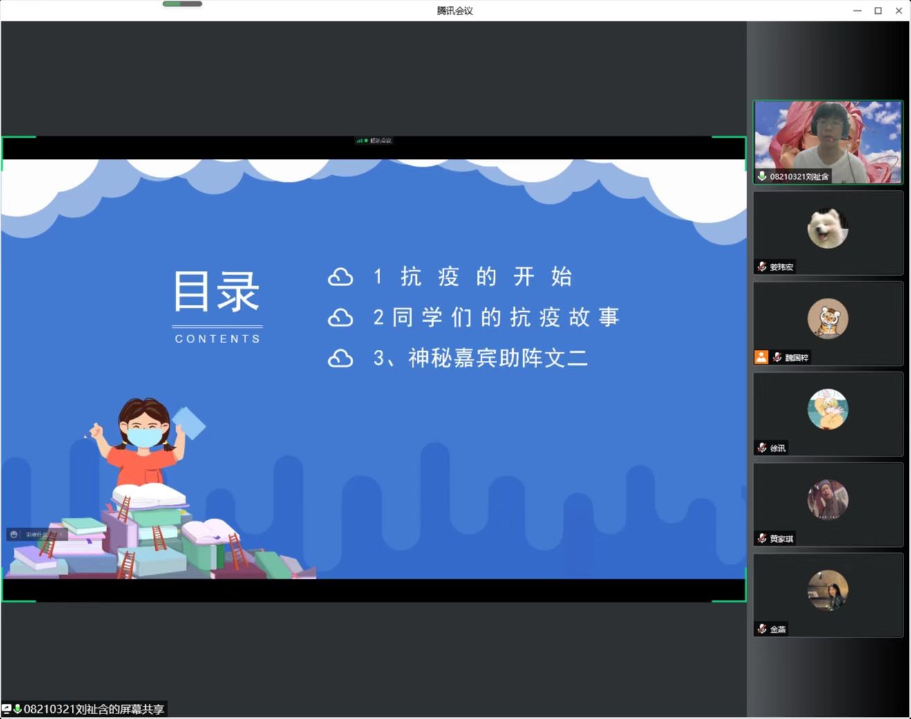 各本科生公寓学生志愿者负责人结合自身经历、抗疫实践、收获感受分享了心得体会。南苑1公寓志愿者负责人、2018级本科生谷瑛淏以“青春政好,疫不容辞”为主题,分享了疫情期间感受到的同学们的友爱与善良、责任与担当、团结与务实;2018级本科生金燕作为南苑9公寓年级志愿者负责人之一,结合个人经历进行了分享,体现了青年学子用志愿精神来诠释当代青年的初心与使命,万众一心、抗击疫情;南苑9公寓年级志愿者负责人、2019级本科生吴晗带领大家回顾了为期50余天的志愿服务,志愿者们无私奉献,出色地完成了各项服务工作。2020级本科生姜玮宏、李珍两位同学共同分享了南苑2公寓的抗疫故事,从日常“三餐一水”的配送,到与其他成人抖音