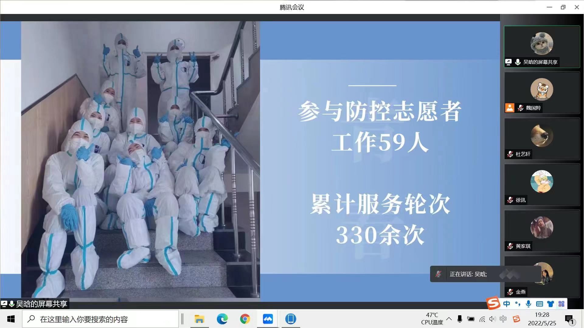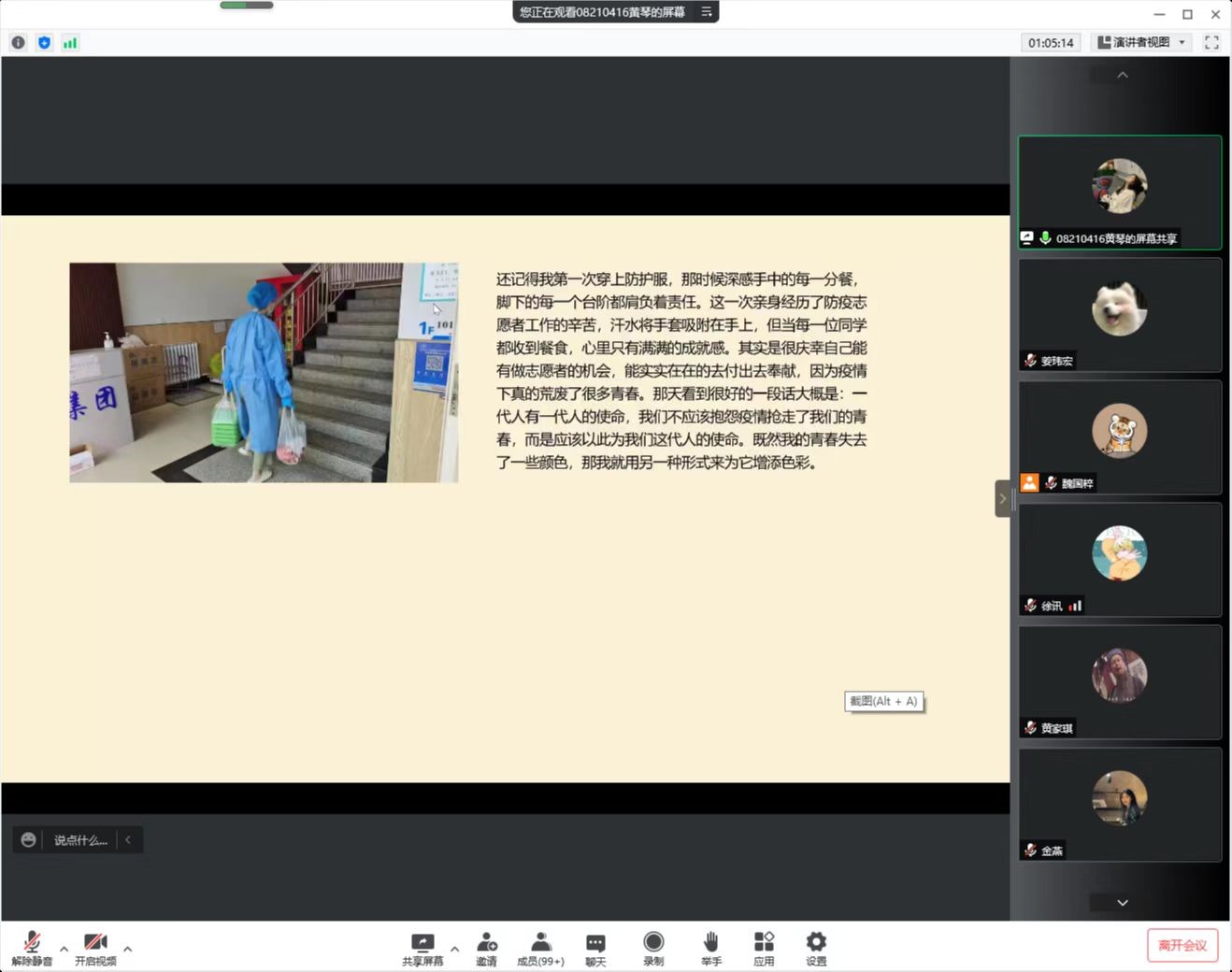 同学的沟通协调,后期的点位志愿者安排等,彰显了同学们众志成城、共克时艰的精神风貌。文苑2公寓志愿者负责人、2021级本科生刘祉含结合几位志愿者的典型事迹,分享了志愿者们在公寓中服务、奉献的感人瞬间;文苑3公寓志愿者负责人、2021级本科生黄琴以“文三中的我们”为题,分享了抗击疫情过程中对于成人抖音