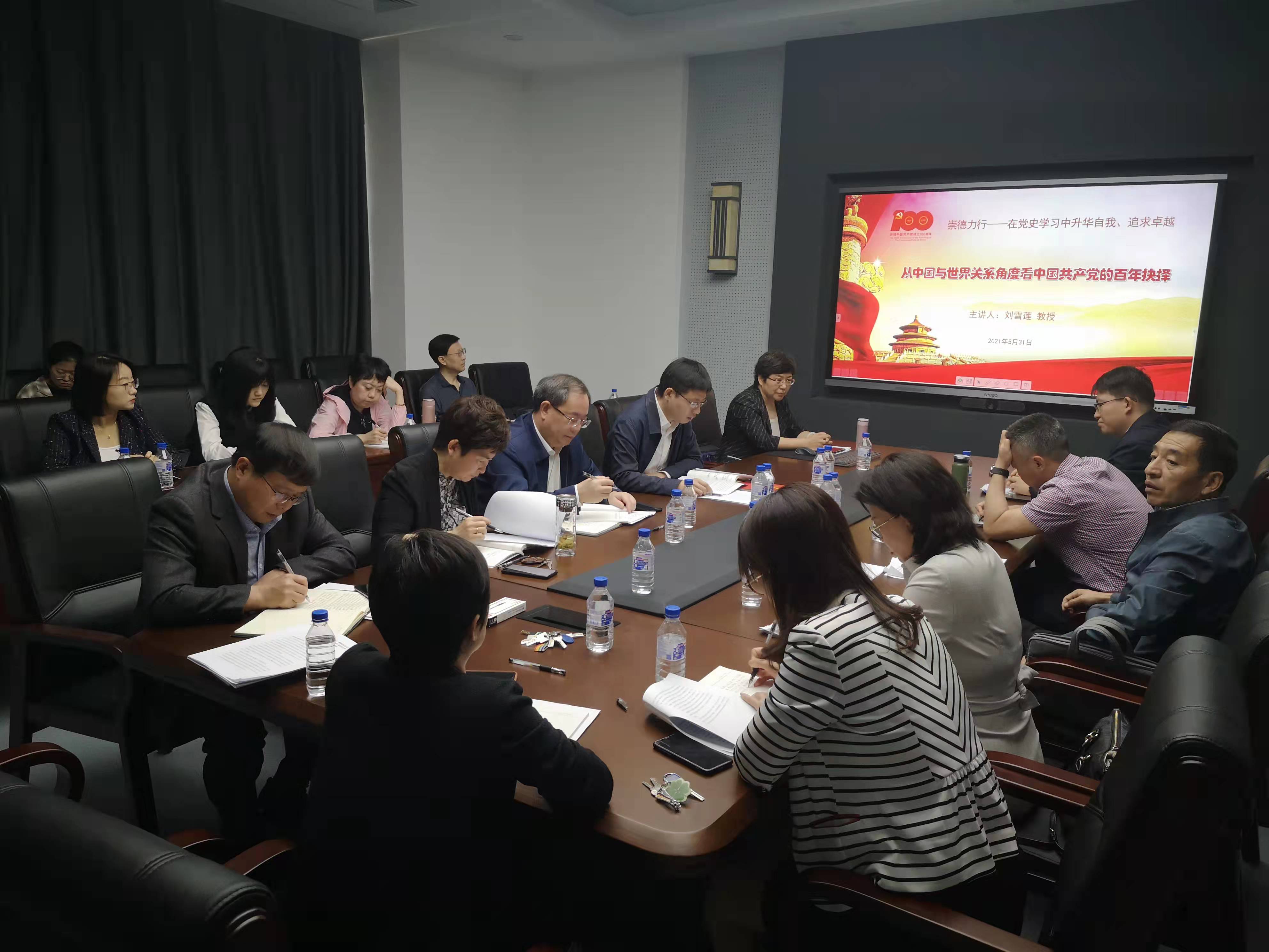 按照成人抖音 党委理论学习中心组党史学习教育第一阶段学习计划,5月31日上午,成人抖音 党委理论学习中心组在东荣大厦B304会议室召开“崇德力行——在党史学习中升华自我,追求卓越”专题学习研讨会。成人抖音 邀请刘雪莲教授做题为“从中国与世界关系角度看中国共产党的百年抉择”专题导学报告,成人抖音 领导班子成员、党委委员、国际政治学系党员参加了本次集中学习研讨,成人抖音 党史学习教育第4指导组列席研讨会并作指导。会议由党委书记马景惠主持。