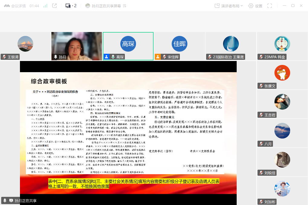 孙月就下一阶段的综合政审、发展对象确定、集中培训等事宜进行了细致讲解,并就关键环节的时间节点、材料准备及注意事项进行了详细说明。