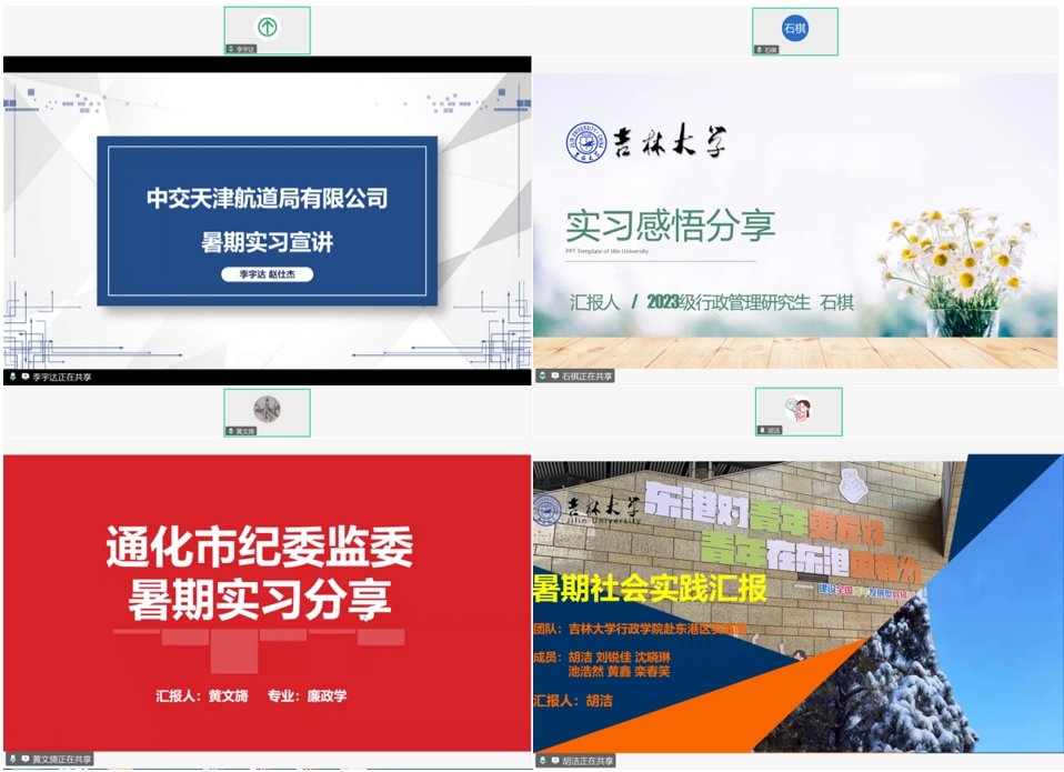 分享环节,中交天津航道局有限公司实习生代表李宇达围绕实习环境、工作内容、自我提升三方面内容进行详细介绍,指出实习兼具满足实践要求与增强就业竞争力的双重价值。江苏南通市域治理现代化指挥中心实习生代表石棋重点介绍了该中心在数据共享、预警预判、联动指挥、行政问效四大领域的先进建设成果,并结合自身参与数据分析、报告撰写的实践经历,说明其为毕业论文写作提供了重要素材与支撑。吉林通化市纪委监委实习生代表黄文旖详细介绍了其参与党群工作、文稿撰写、信访接待、警示教育片制作等实践经历,表示此次实习显著提升了自身资料处理、公文写作、组织协调等实务能力。山东日照东港区人社局实习生代表胡洁则从实习单位的区位环境、岗位设置以及自身实习收获三个方面展开分享,认为实习深化了自身对体制内工作机制的理解,为未来职业规划提供了参考。
