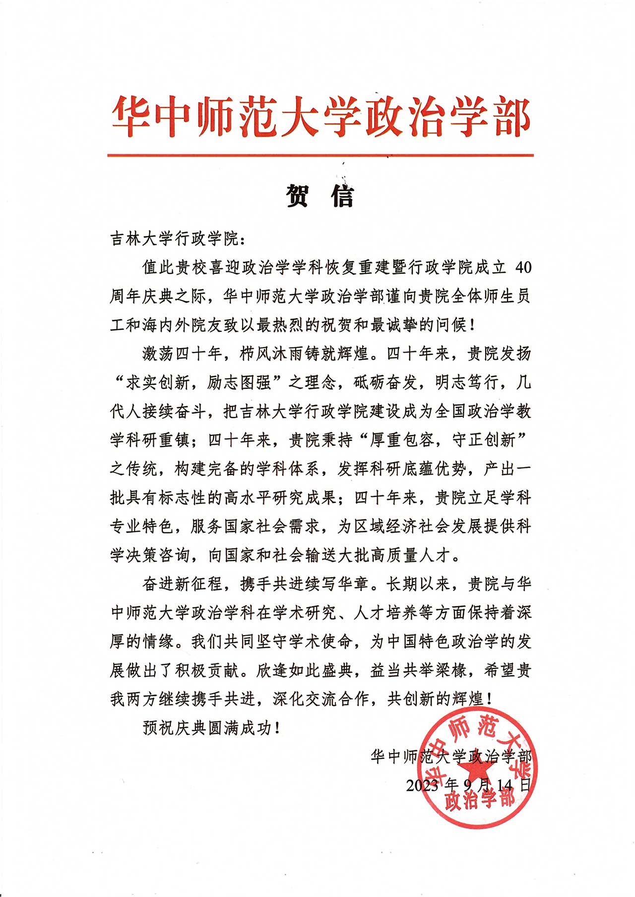 华中师范大学政治学部的贺信