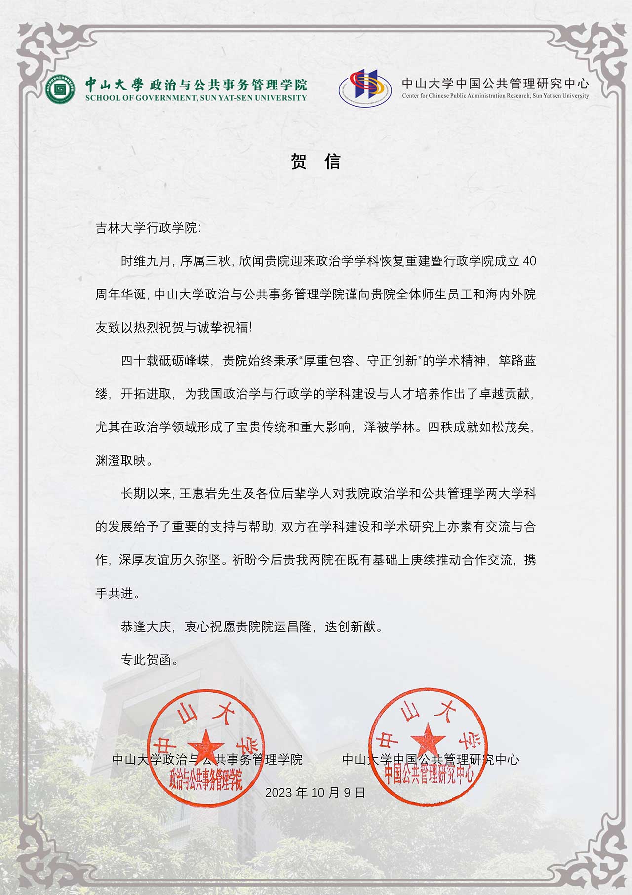 中山大学政治与公共事务管理学院、中国公共管理研究中心的贺信
