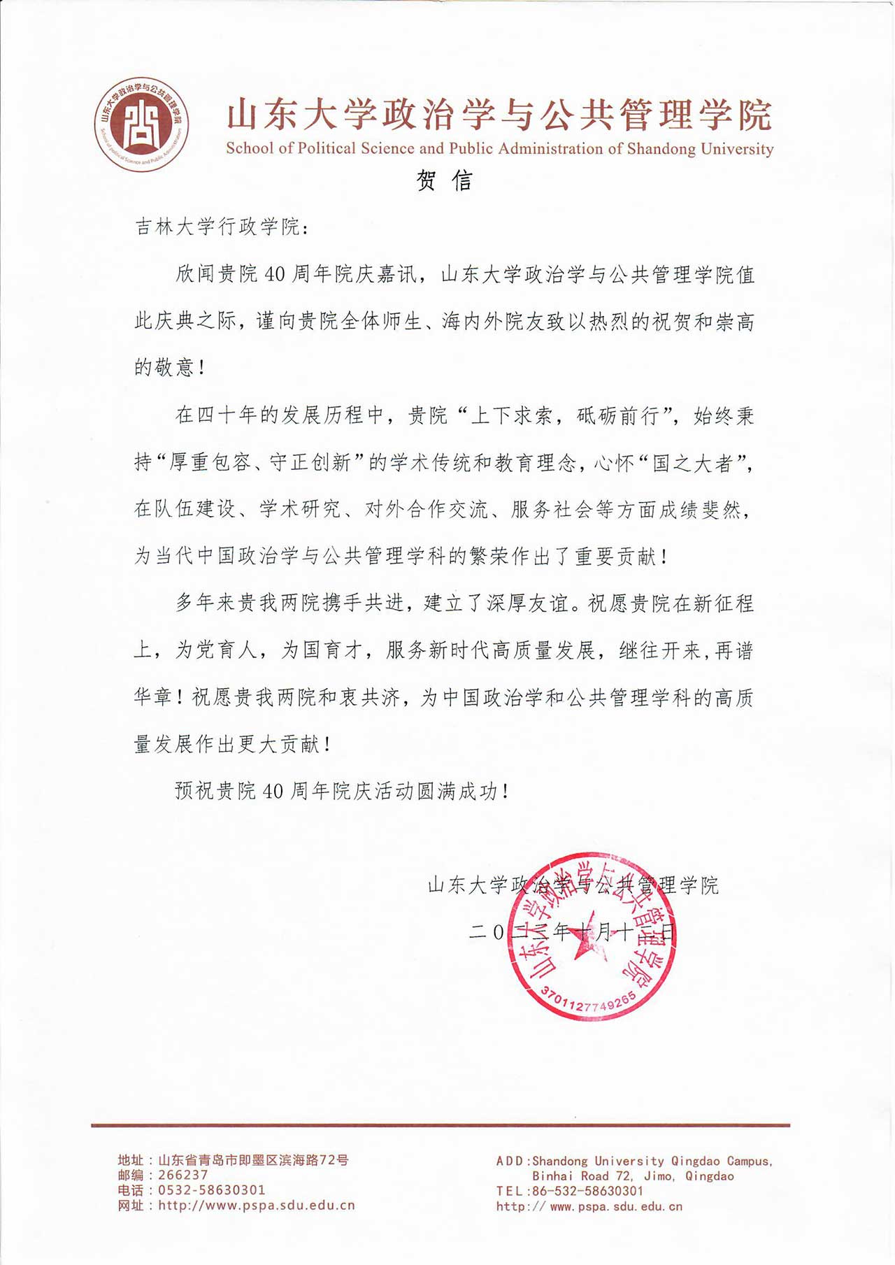 山东大学政治学与公共管理学院的贺信